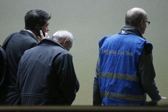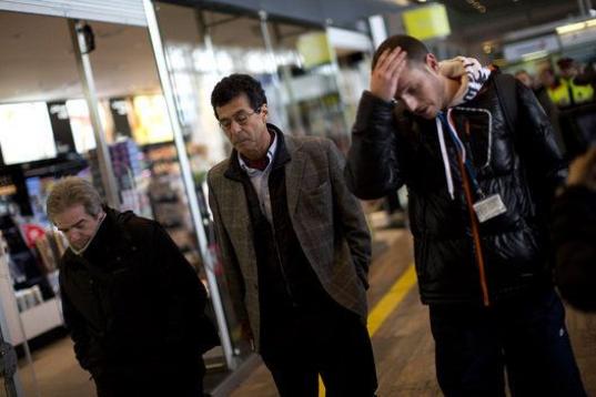 Dos hombres que esperaban el vuelo en Dusseldorf son guiados por el personal del lugar.