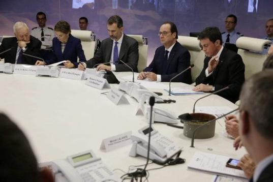 El ministro de Asuntos Exteriores español, José Manuel García Margallo, los Reyes de España, el presidente francés François Hollande, y el primer ministro francés, Manuel Valls, participan en el gabinete de crisis conjunto que los gobiern...