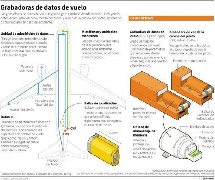 Las llamadas cajas negras son dos aparatos de unos 4,5 kilos y del tamaño de una caja de zapatos que, en realidad, no son negras, sino rojas o anaranjadas y con bandas reflectantes para facilitar su localización. Se llaman negras porque suelen tornarse de este color cuando se produce un incendio en el avión.