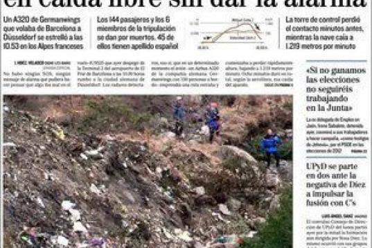 El accidente del vuelo de Germanwings en los Alpes franceses ocupa las principales portadas de la prensa nacional e internacional de este miércoles. Los principales diarios se preguntan por qué el avión no dio señal de alarma antes de caer en picado durante ocho minutos.