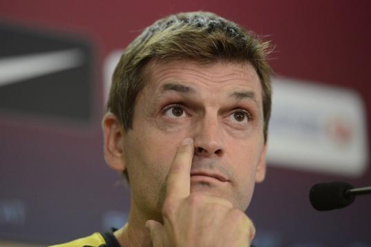 El técnico del Barcelona, Tito Vilanova, aparece en una rueda de prensa el 30 de abril de 2013 en San Joan Despi, Barcelona. El club anunció la salida del timonel el vienes, 19 de julio de 2013, por una recaída de cáncer. (AP Photo/Manu Fern...