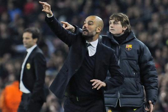 Esta fotografía de archivo del 3 de abril de 2012 muestra al entrenador del Barcelona, Pep Guardiola, al centro, cuando da una instrucción a sus jugadores mientras su asistente Tito Vilanova, detrás a la derecha, señala algo en el partido de...