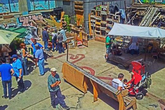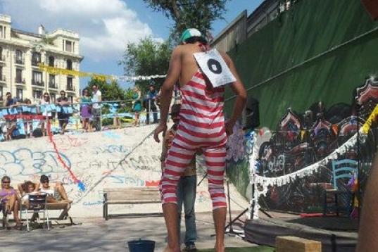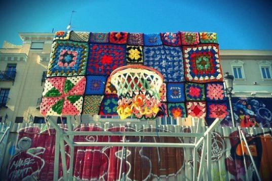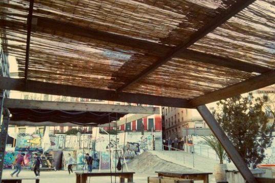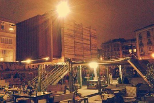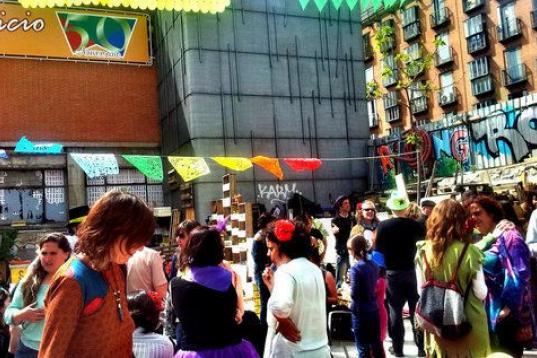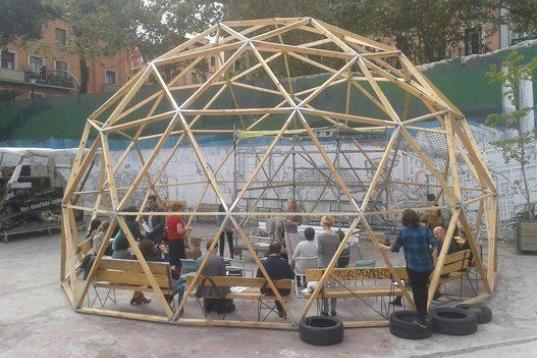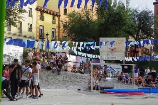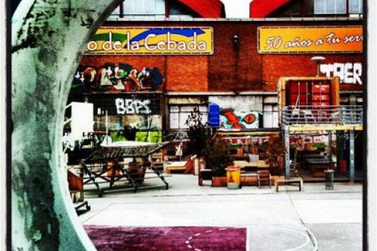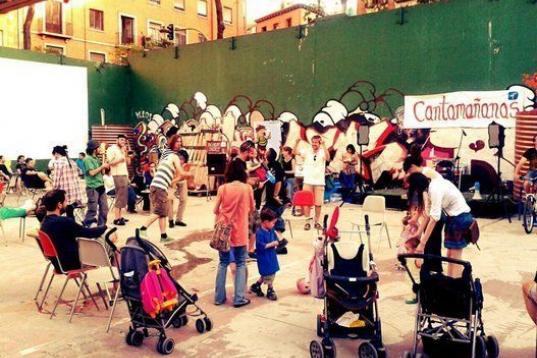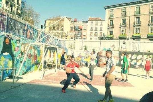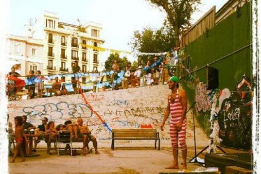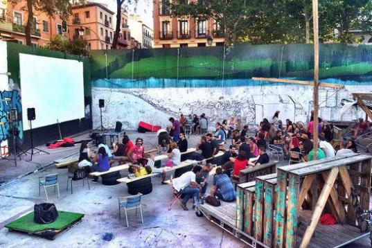 Al salir del metro de La Latina en Madrid, a la derecha, hay una valla pintada de azul y blanco que recorre media manzana. Cinco puertas de lavadora que hacen las veces de ojos de buey invitan a curiosear qué hay del otro lado. Pocos se resisten a asomarse. Los días de Rastro, cuando el barrio está más concurrido, hasta tienen que hacer turnos para mirar. Lo que ven es un gran espacio con los muros pintados con grafitis, gradas de madera, una pequeña torre con un contenedor de obra en lo alto, una cancha de baloncesto, un huerto, una cúpula geodésica y gente. Gente que charla en grupos, que lee un libro al sol, que escucha conciertos, que ve películas en verano, que monta mercados de trueque y fiestas con piscinas hinchables. Lo que no se ve es que todo es obra de unos pocos vecinos muy motivados y con ganas de hacer cosas, que lucharon para recuperar un espacio que el Ayuntamiento les arrebató al tirar la piscina del barrio.