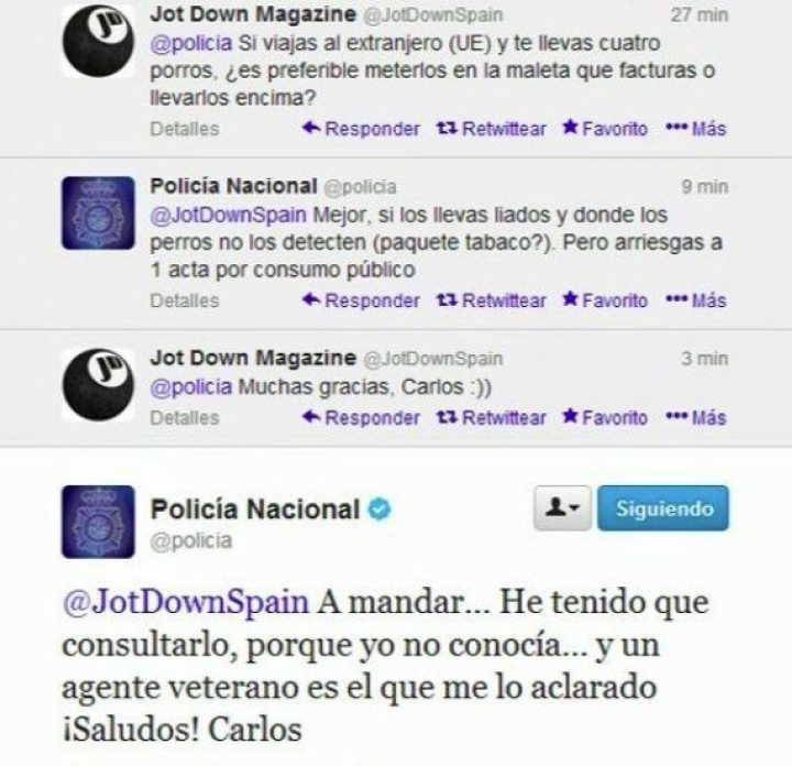 "La letra con sonrisa o con sorpresa entra", explica el responsable de las redes sociales de la Policía que añade que la clave del éxito es que los mensajes tienen una "orientación real a la gente". "Hay que dejar de mirarse el ombligo, dejar de lado el lenguaje institucional y pensar qué puedes aportar a la gente, qué le puede interesar y cómo lo puedo contar para interesarle más".