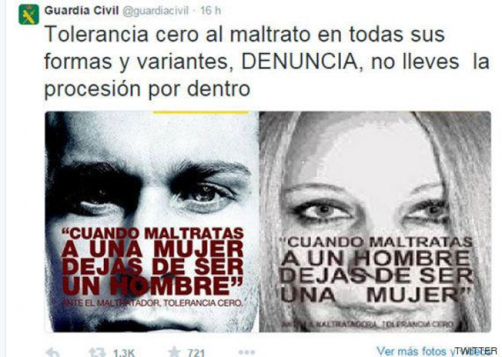 El debate está servido. Hace unas horas, la cuenta oficial de Twitter de la Guardia Civil causaba un gran revuelo al reproducir una campaña falsa en contra del maltrato con frases como: "Cuando maltratas a un hombre, dejas de ser una mujer" o "Denuncia, no lleves la procesión por dentro". Este es el tuit en cuestión: