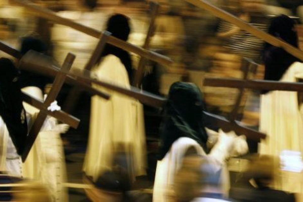 Penitentes se azotan la espalda durante una procesión de la hermandad de "Los Picaos en La Rioja.