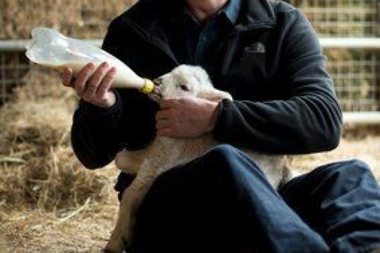 Cameron en campaña: amamanta a un cordero durante una visita a una granja