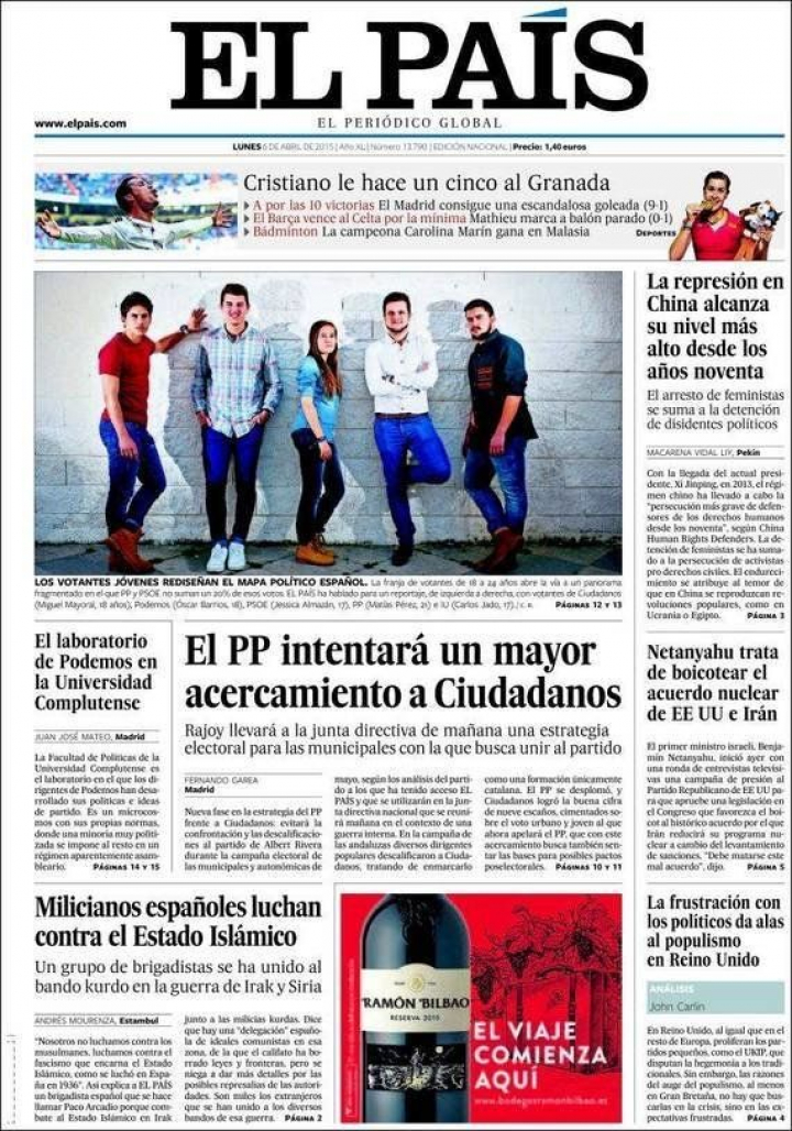 Grupos de jóvenes haciéndose 'selfies' en el nuevo mirador de Barcelona o posando en actitud entre indolente y desafiante. Son "los votantes jóvenes que rediseñan el mapa político español", reseña El País en el pie de foto de primera, mientras en el interior les concede la palabra. Jessica, la única chica de los cinco seleccionados, tiene 17 años y votará al PSOE: "No creo que España sea un país que prometa prosperidad. Mi madre está parada". Matías, 21 años, votará al PP y asegura: "La corrupción es detestable. Y más si es la de mi partido".