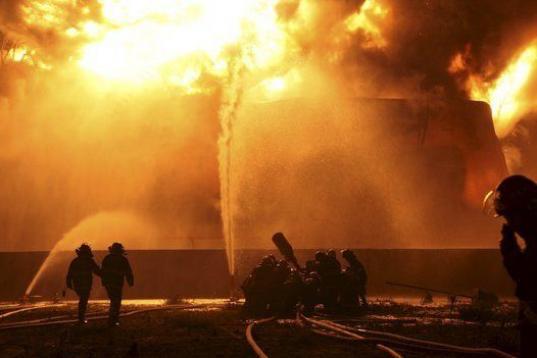 Bomberos intentan extinguir un fuego en una planta petroquímica en Zhangzhou (China).