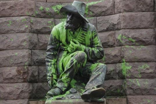 Estatua conmemorativa del héroe africano Paul Kruger cubierta de pintura en el centro de Pretoria (Sudáfrica). Supuestamente, activistas del partido izquierdista Luchadores de la Libertad Económica arrojaron pintura contra el monumento tras e...
