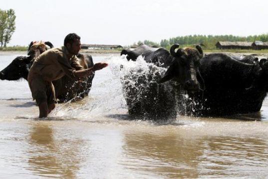 Un hombre lava su ganado en el río Sardaryab, cerca de Peshawar (Pakistán).
