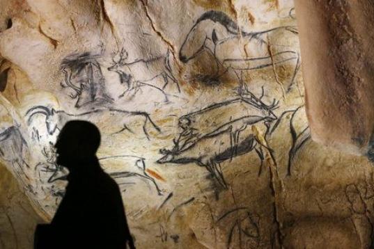 Un visitante observa las paredes en el interior de la réplica de la cueva de Chauvet, cerca de Vallon-Pont-D'arc, al sur de Francia.