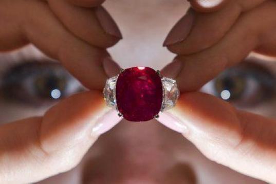 Empleada de una casa de subastas de Londres (Inglaterra) posa con "El Rubí del Amanecer", un rubí birmano de 25.59 quilates que está estimado entre 12 y 18 millones de dólares. La piedra preciosa será subastada en Génova en mayo de este año.