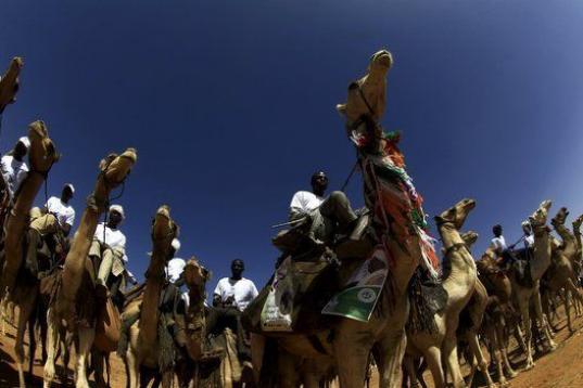 Simpatizantes del Partido del Congreso Nacional de Sudán montan en camello para asistir a una reunión de apoyo al partido de cara a las elecciones de 2015 en Al Fashir (Sudán).