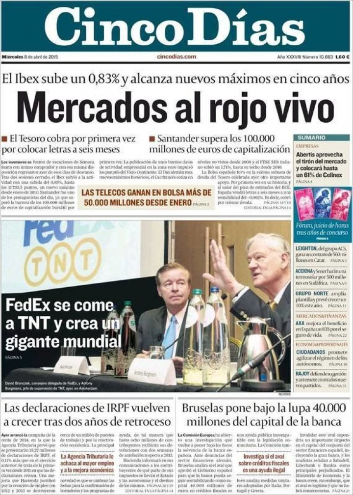 "Mercados al rojo vivo", titula a toda página Cinco Días después de que el IBEX subiera ayer un 0,83% y alcanzase nuevos máximos en cinco años. El dinero se mueve y España también recibe el respaldo financiero porque, como destaca ABC, "España cobra por primera vez por colocar deuda pública a corto plazo". Gracias, explica, a las compras del Banco Central Europeo y a una mejora económica que Hacienda ve en que "las declaraciones de IRPF vuelven a crecer tras dos años de retroceso".