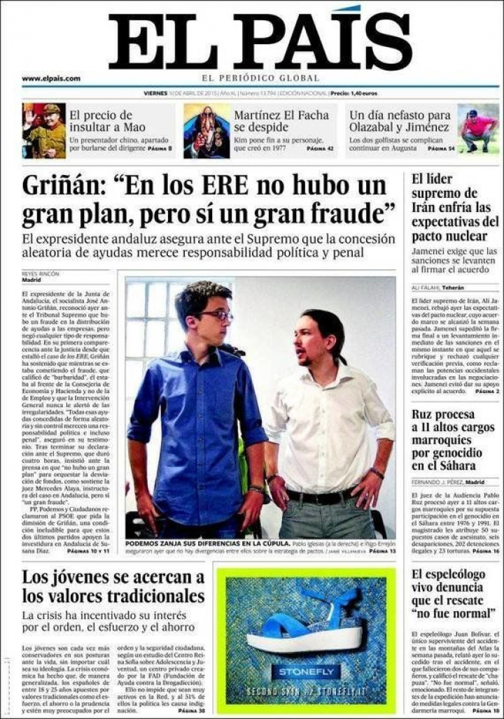 Un Griñán con cara de circunstancias que deja una frase paradigmática: "En los ERE no hubo un gran plan, pero sí un gran fraude", asegura abriendo El País, que destaca también que el expresidente andaluz aseguró ante el juez que "la concesión aleatoria merece responsabilidad política y penal".