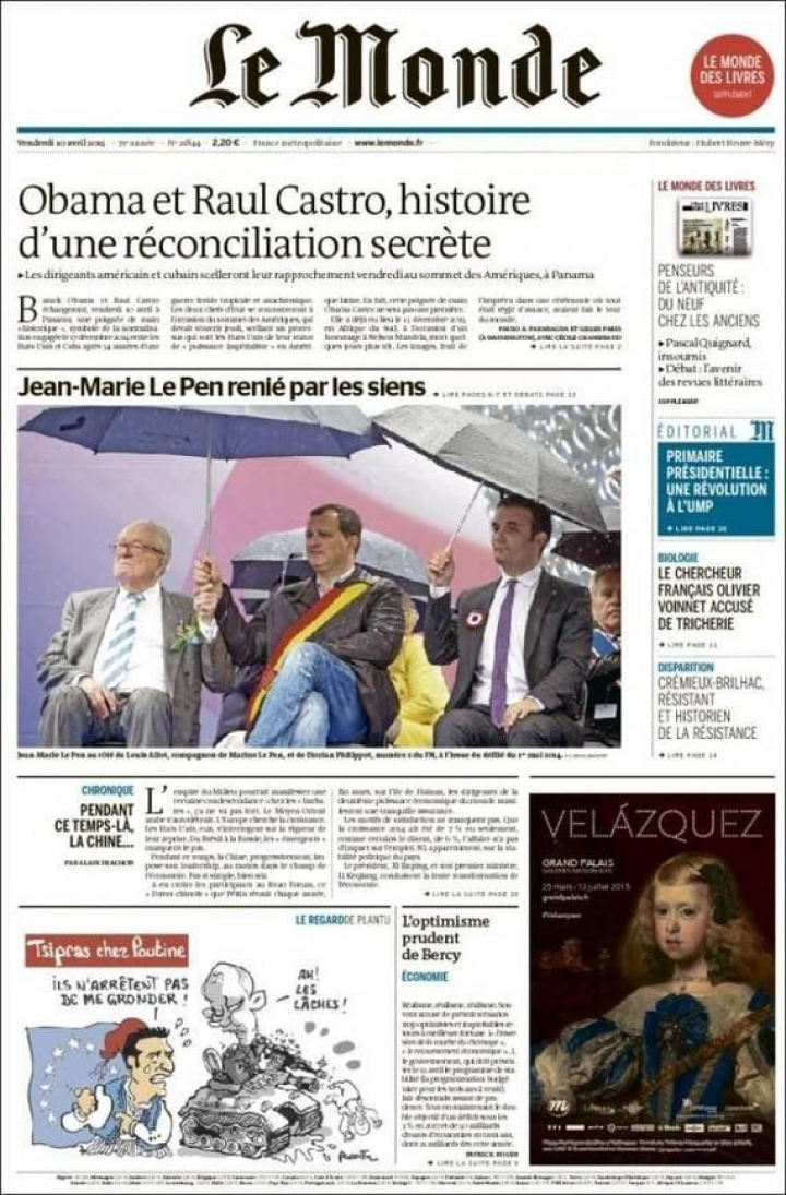 "Obama y Raúl Castro, historia de una reconciliación secreta". Es la propuesta de Le Monde para avanzar que "los dirigentes estadounidense y cubano sellarán su aproximación en la Cumbre de las Américas en Panamá". El vespertino francés recuerda, no obstante, que el posible saludo no será una primicia porque ya tuvo lugar el 15 de diciembre de 2013 en Sudáfrica, con motivo al homenaje mundial a Nelson Mandela.