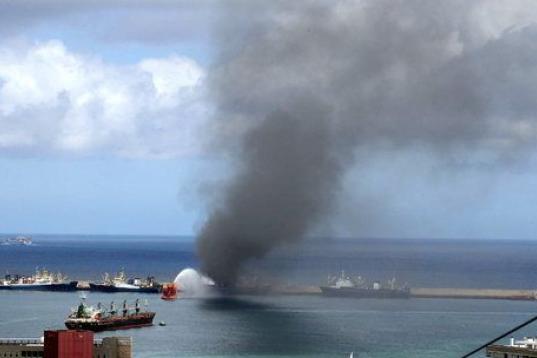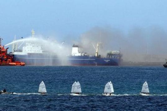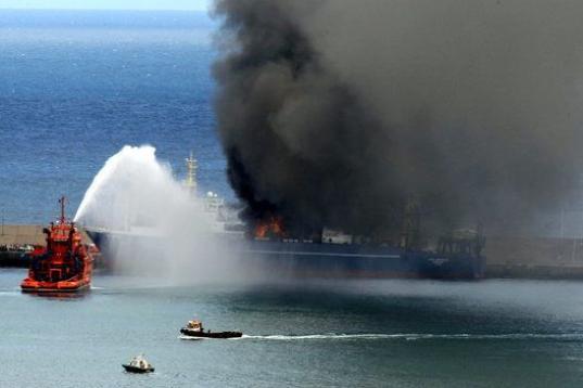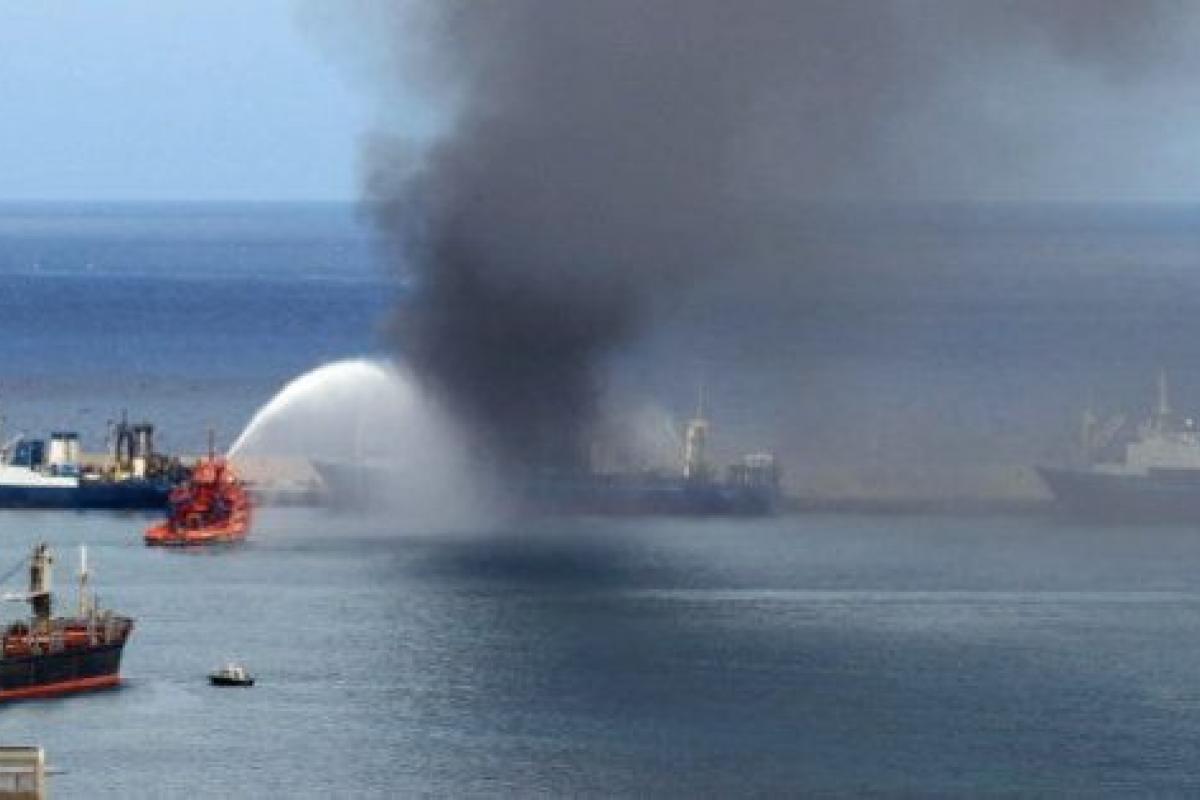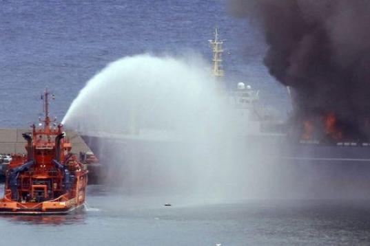 El barco, de nombre "Oleg Naidenov" y de bandera rusa, fue remolcado inicialmente esta madrugada fuera del recinto portuario ante el riesgo de que virase como consecuencia de la gran cantidad de agua utilizada para apagar el fuego.