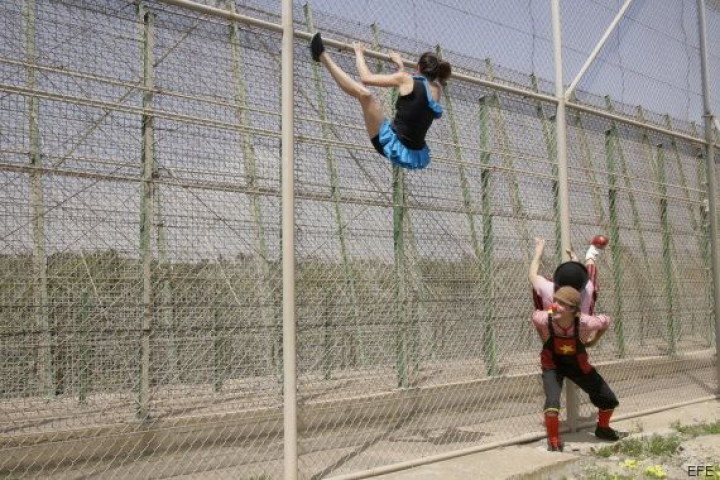 Tres activistas, pertenecientes al grupo Pallasos en Rebeldía han protagonizado este lunes un acto de protesta ante la valla de Melilla, con un desnudo con el que han pretendido llamar la atención para denunciar la "aberración" que supone ésta y otras fronteras del mundo.