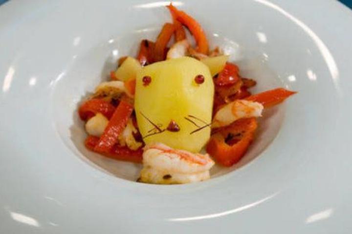 No se puede decir que León come gamba sea precisamente complicado. El plato que ha alzado a la popularidad en media España a Alberto, el primer expulsado de MasterChef 3, se basa principalmente en una patata mediana (que aparece como la cabeza del león), pimiento y gambas (las que se come, justamente, ese león).