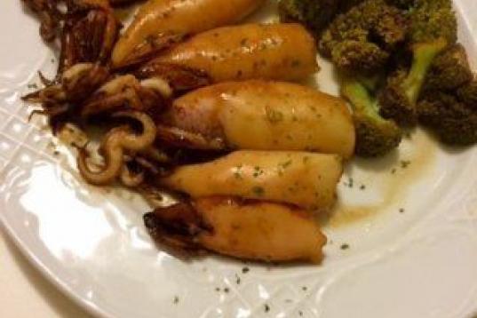 Con calamares pequeños, brócoli, mostaza, salsa de soja y perejil picado. Puedes ver aquí la receta completa.