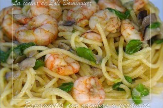Las gambas se acompañan de pimiento verde, cebolla y setas. Puedes consultar aquí la receta.