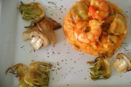 Además de gambas al curry, lleva alcachofas, setas, cebolla, ajos y sofrito de tomate. Puedes ver aquí la receta completa.