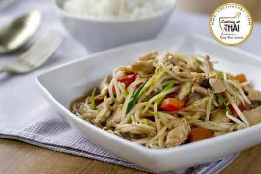 Los ingredientes son brotes de soja, carne de cerdo, tomate, cebolleta, dientes de ajo, salsa de ostras, salsa de soja, azúcar, pimienta blanca y aceite. Aquí puedes ver la receta completa.
