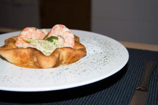 Sólo hace falta masa brisée, langostinos, salsa rosa y lechuga iceberg. Aquí tienes cómo prepararlo.