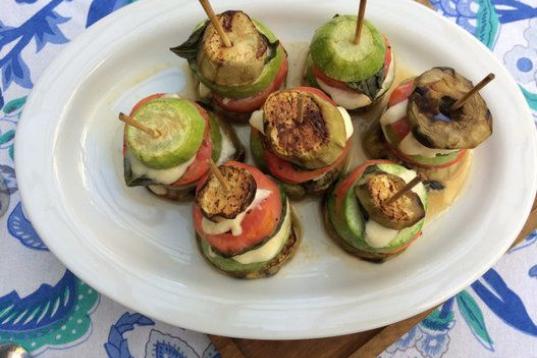 Cada torre lleva berenjena, calabacín, tomate, mozzarella y albahaca fresca. Aquí puedes ver la receta completa.