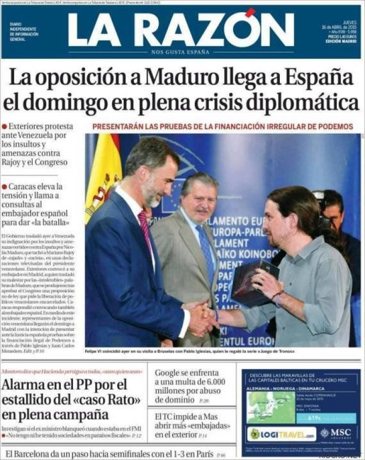 El líder de Podemos le regaló la serie televisiva de Juego de Tronos al monarca. Pero el gesto de Iglesias tiene otra vertiente política que reseña El País en un editorial: "Ganó por la mano a la formación que encabezan Cayo Lara y Alberto Garzón" porque se convirtió en protagonista de la recepción y consiguió que el boicot de los eurodiputados de Izquierda Unida al rey pasara del todo inadvertida. Para Ignacio Camacho, en ABC, el gesto de Iglesias apunta a que "en vez de asaltar el palacio de Invierno, Iglesias se ve a sí mismo tomando café como invitado en el de La Zarzuela".