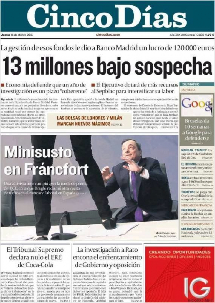 En forma de confeti y octavillas que una activista lanzó a Mario Draghi subiéndose a la mesa de las ruedas de prensa del BCE y que Cinco Días resume con precisión: "Minisusto en Fráncfort". Para el presidente de la entidad y para los asalariados españoles, porque Draghi "reclamó otra vuelta de tuerca en el mercado laboral en España". Como un eco, desde Washington, el economista jefe del FMI, Olivier Blanchard, señala en una entrevista en El País que "España no debe resignarse a tener un paro tan alto" y la clave es "eliminar las diferencias entre trabajadores fijos y temporales". Hasta que el desempleo no baje, "la recuperación española no puede aún considerarse una historia de éxito”.