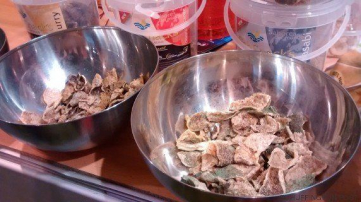 A simple vista parecen una mezcla entre patatas fritas y cortezas, pero nada más lejos: se trata de tiras de piel de bacalao fritas en aceite vegetal a 150ºC. “Son bajas en calorías, no tienen colesterol ni gluten y son ricas en Omega 3”, explica un representante de la empresa alicantina Fish Snack’s. “También se pueden utilizar para cocinar, por ejemplo, si se trituran pueden servir para rebozar croquetas”, afirma. Los hay con sabor mediterráneo, barbacoa, curry, wasabi, oriental picante y punto de sal marina. También se comercializan hechos con piel de salmón.