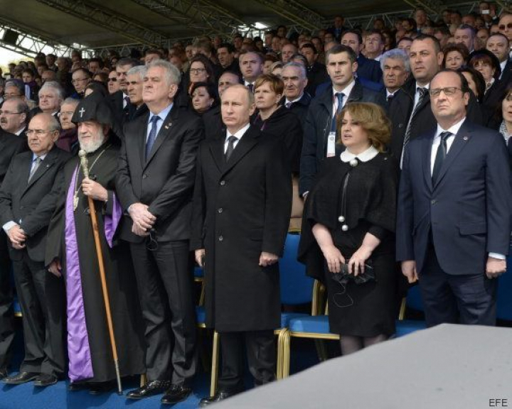 Un acto en Erevan, la capital de Armenia, conmemorará hoy esos 100 años de aquel 24 de abril. A él asisten jefes de Gobierno como el presidente ruso, Vladimir Putin, y el francés, François Hollande. A su llegada a Tsitsernakaberd, a las afueras de la capital armenia, Putin y Hollande fueron recibidos por el presidente armenio, Serge Sargsián, en la avenida que da paso al complejo donde arde la llama eterna en tributo a las víctimas. Seguidamente, ambos mandatarios fueron acompañados de la mano por sendas niñas y colocaron una rosa amarilla en una gigantesca ofrenda floral.