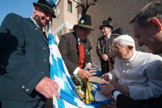 Aunque en la Santa Sede es tradición celebrar las onomásticas, el papa alemán festejó su cumpleaños a las puertas de su residencia, el convento "Mater Ecclesiae", junto a un grupo de personas ataviadas con el traje típico de su región de origen.