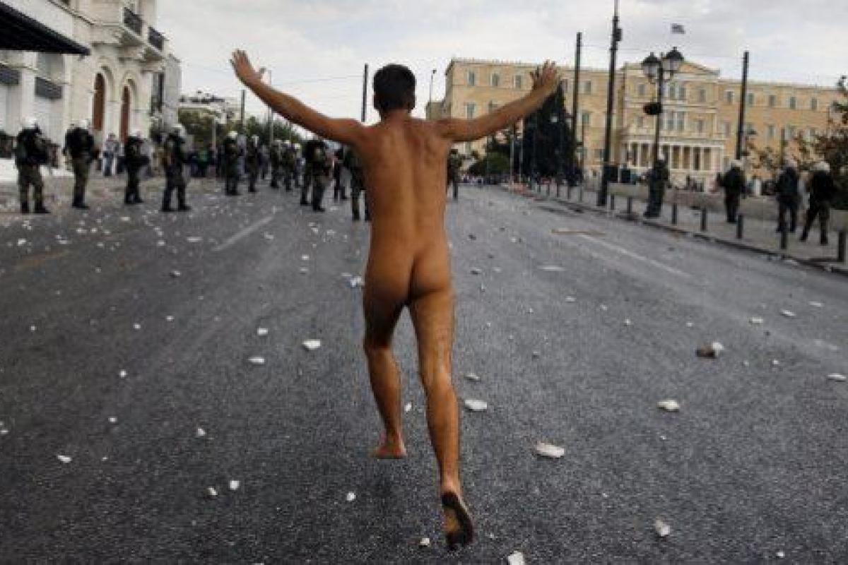 Un trabajador muestra el culo a los antidisturbios desplegados en los alrededores del Parlamentos europeo en Bruselas durante las manifestaciones de trabajadores y sindicalistas de la UE para pedir más protección laboral.
