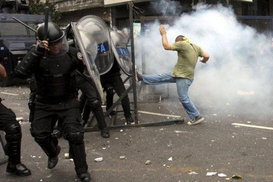 Un estudiante de la Federación Universitaria de la Universidad de Buenos Aires pega una patada a una barricada policial frente al Congreso, levantada durante las protestas contra la elección de un nuevo rector.
