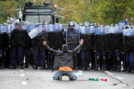 Un manifestante se enfrenta a los antidisturbios durante una protesta antigubernamental en Budapest (Hungría).