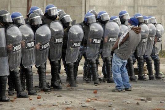 Un simpatizante opositor de enfrenta con las manos desnudas a los antidisturbios que protegen el palacio presidencial de Taipei (Taiwan).