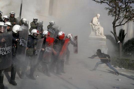 Un manifestante tira una piedra a los policías apostados a las afueras del Parlamento griego durante los violentos choques en Atenas entre la población, azotada por la crisis, y las fuerzas de seguridad que sirven de escudo a los políticos qu...