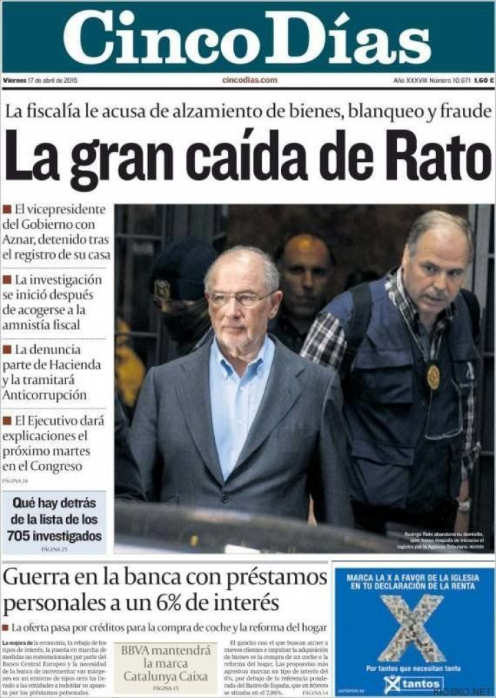 El impacto de una noticia se mide en la prensa escrita por su extensión y reiteración en uno y otros periódicos. La detención de Rato es ya una de las noticias del año...