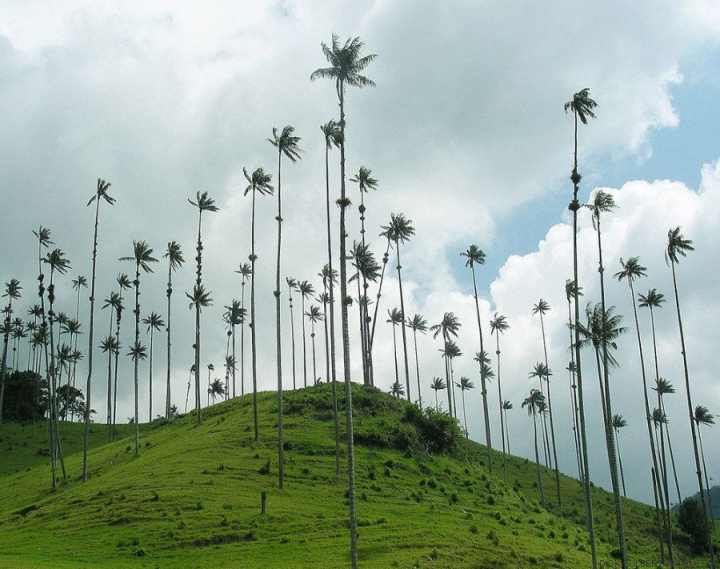 Es la palmera más alta del mundo y su tronco está cubierto de cera. Crece muy lentamente pero puede vivir hasta 100 años. La deforestación y los extensos pastos para el ganado la han puesto en peligro de extinción.