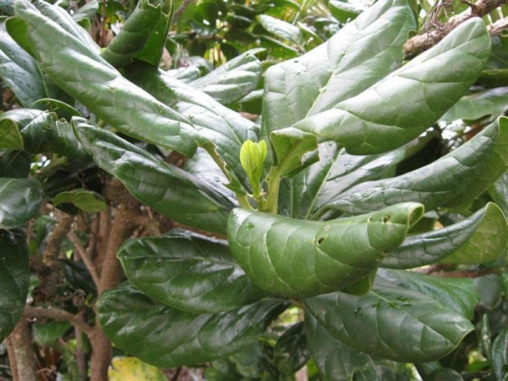 Crece en una ladera verde de la isla más grande del archipiélago, cerca de la costa. Tiene varios troncos de los que crecen grandes hojas de un verde oscuro brillante. Sus flores son pequeñas y verdes, y crecen en racimos de octubre a noviembre. Sus frutos son morados, de unos 10 milímetros y contienen una única semilla.