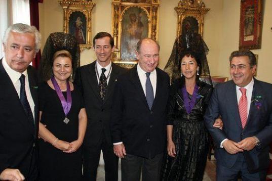 El vicesecretario de Política Autonómica y Local del PP, Javier Arenas, y el alcalde de Sevilla, Juan Ignacio Zoido, hacen de anfitriones de Rato durante el Jueves Santo de 2007.