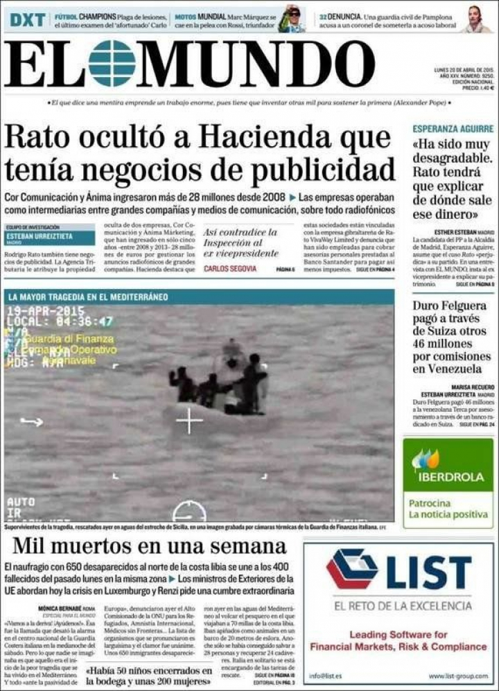 La tragedia en el Mediterráneo comparte protagonismo en la prensa nacional con el caso Rato, que sigue acaparando titulares y comentarios...