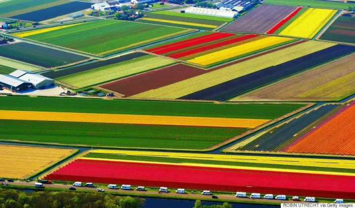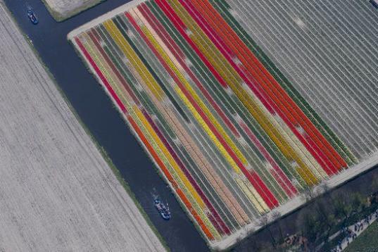 Campos de tulipanes, desde un avión sobrevolando Keukenhof (Holanda).