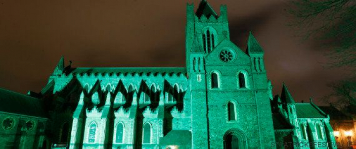 La catedral protestante de San Patricio en Dublín, iluminada de verde.