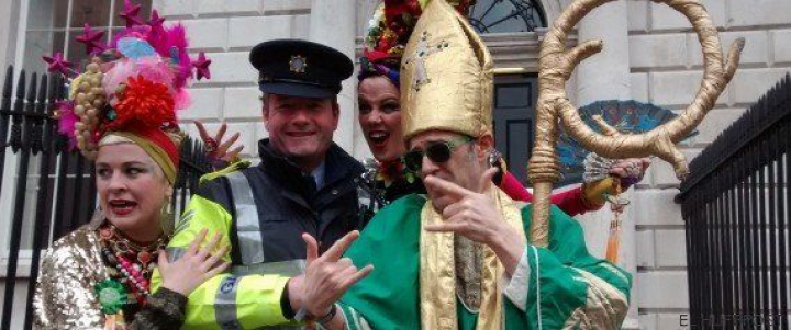 Un agente de la Garda posa junto con el 'San Patricio oficial' de 2015 y dos animadoras del desfile