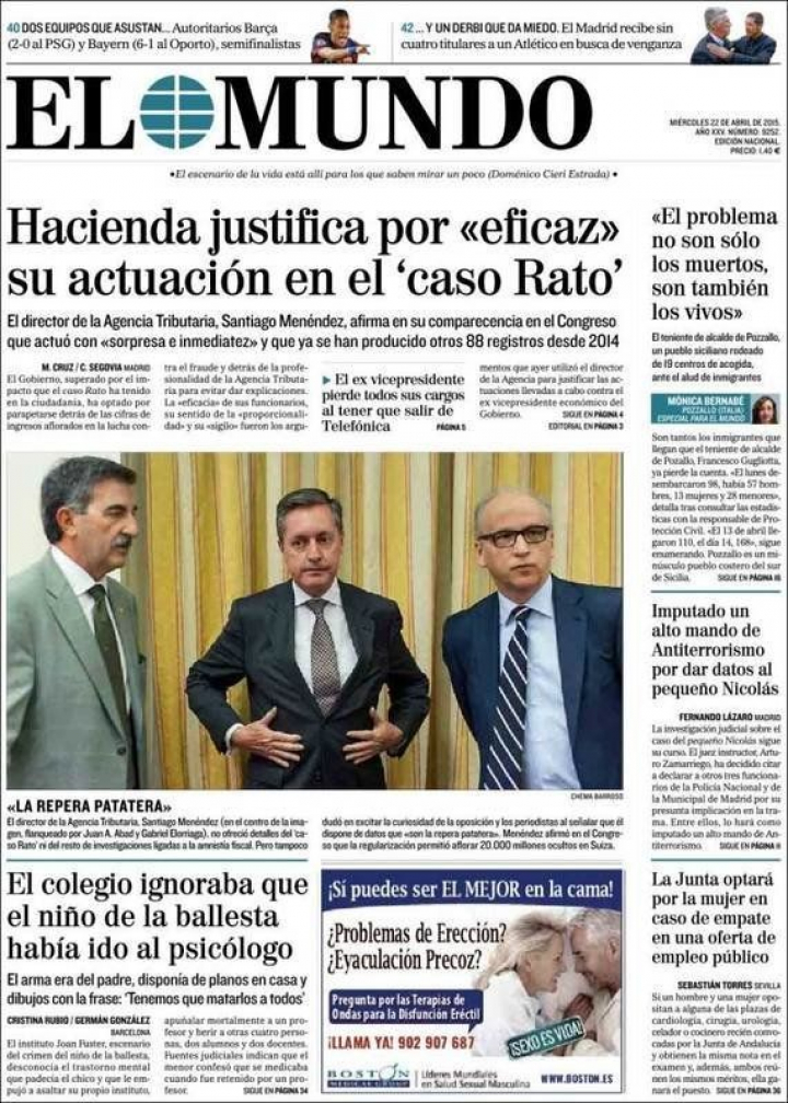El caso es que "nadie quiere el caso Rato", señala José Manuel Romero, y de ahí que El País concluya en su apertura que "la actuación de Hacienda deja el caso Rato en el limbo" y ABC nos presente "las sombras de una detención nada convencional: irregularidades, intrigas y chivatazos".