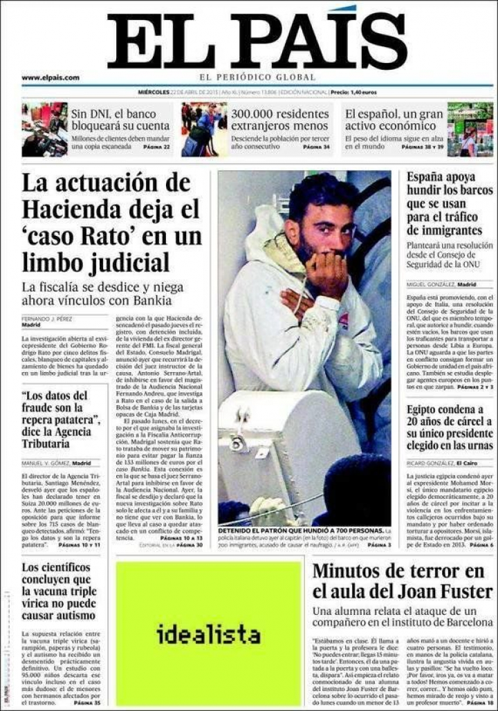 España, leemos en El País, "apoya hundir los barcos que se usan para el tráfico de inmigrantes" y así lo planteará en el Consejo de Seguridad. Mientras que Le Monde se pregunta si el camino a seguir es el de Australia; cero muertos en naufragios, pero también ningún inmigrante ilegal en su territorio mediante acuerdos con terceros países que hacen la labor de policía y a una inexistente política de asilo y refugio.